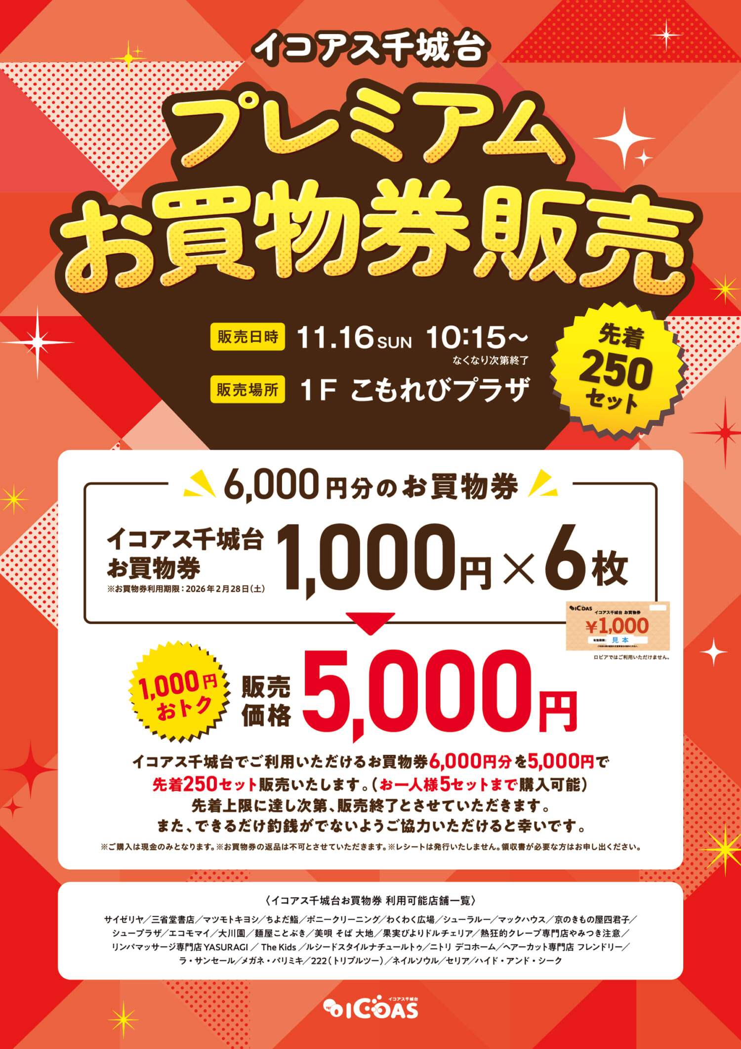 イコアス千城台の対象店舗で使用できるお買物券6,000円分を、なんと5,000円で販売いたします!!(先着250セット限定)