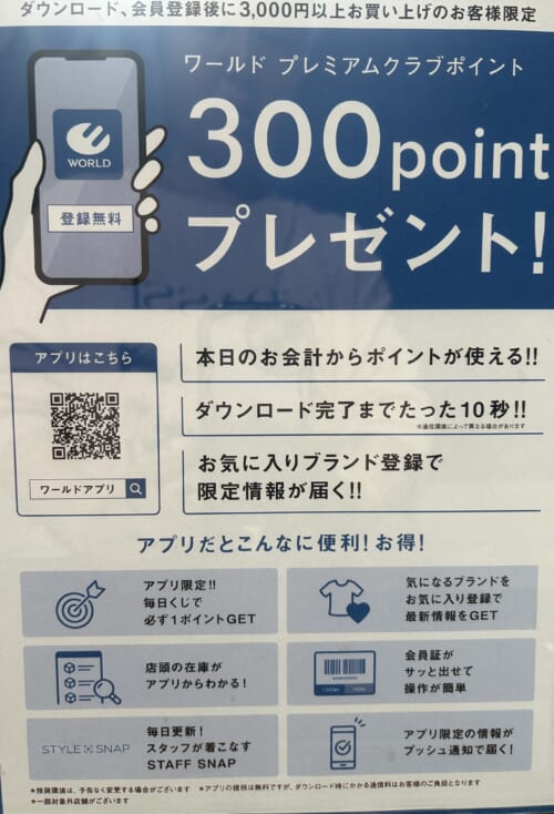ワールドプレミアムクラブアプリを新規ご登録のお客様限定、税込¥3,000以上お買い上げで¥300OFFとなります。