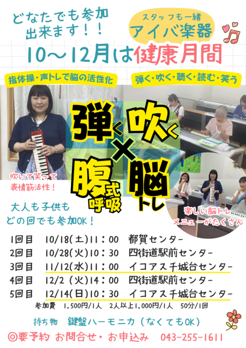 こんにちは、アイバ楽器です。10月から12月までの3か月間を“健康月間”として、音楽を通じた健康づくりイベントを開催します!