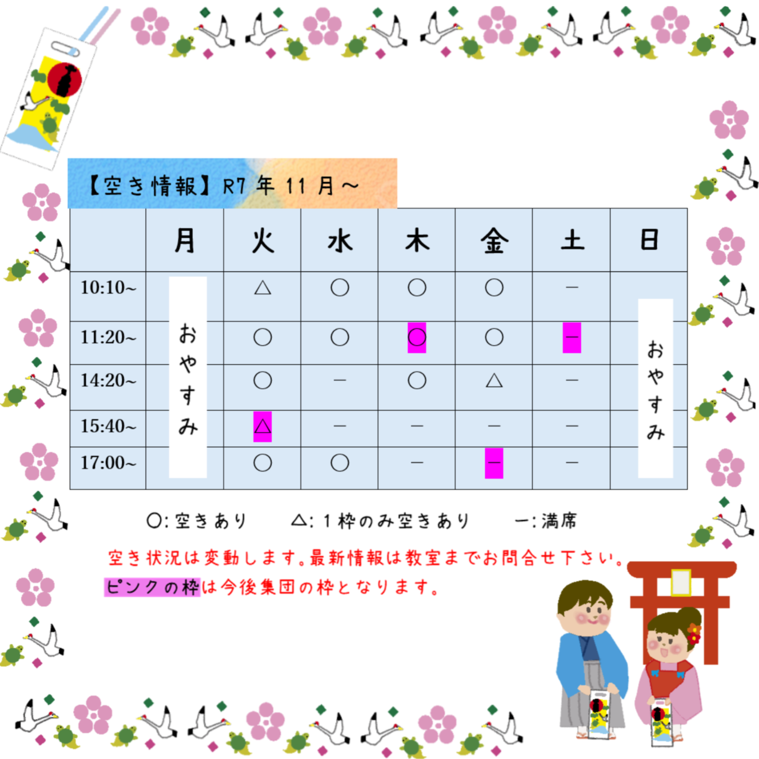 教室の空き情報をお知らせいたします☆
