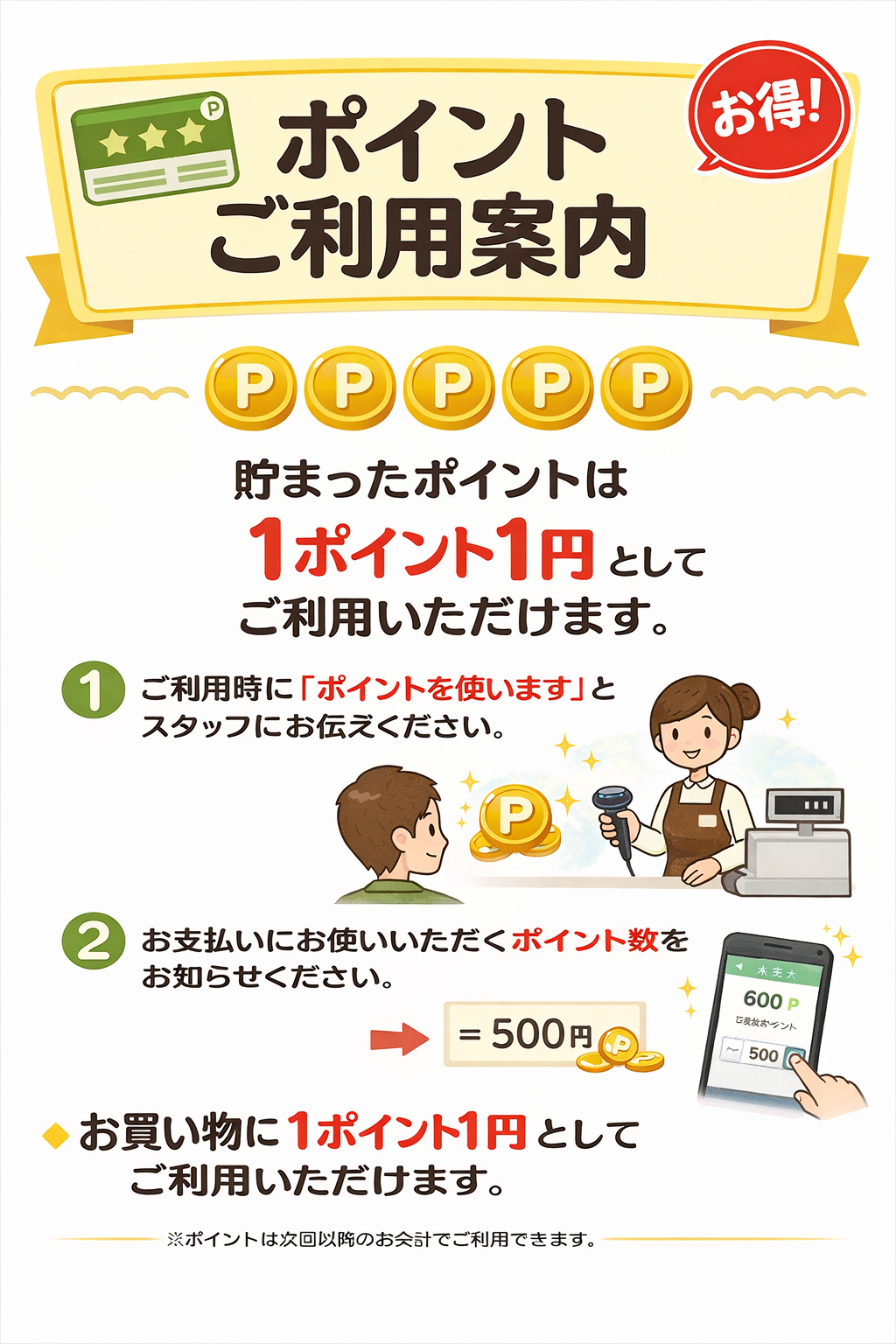 貯まったポイントは1ポイント1円としてご利用いただけます。
