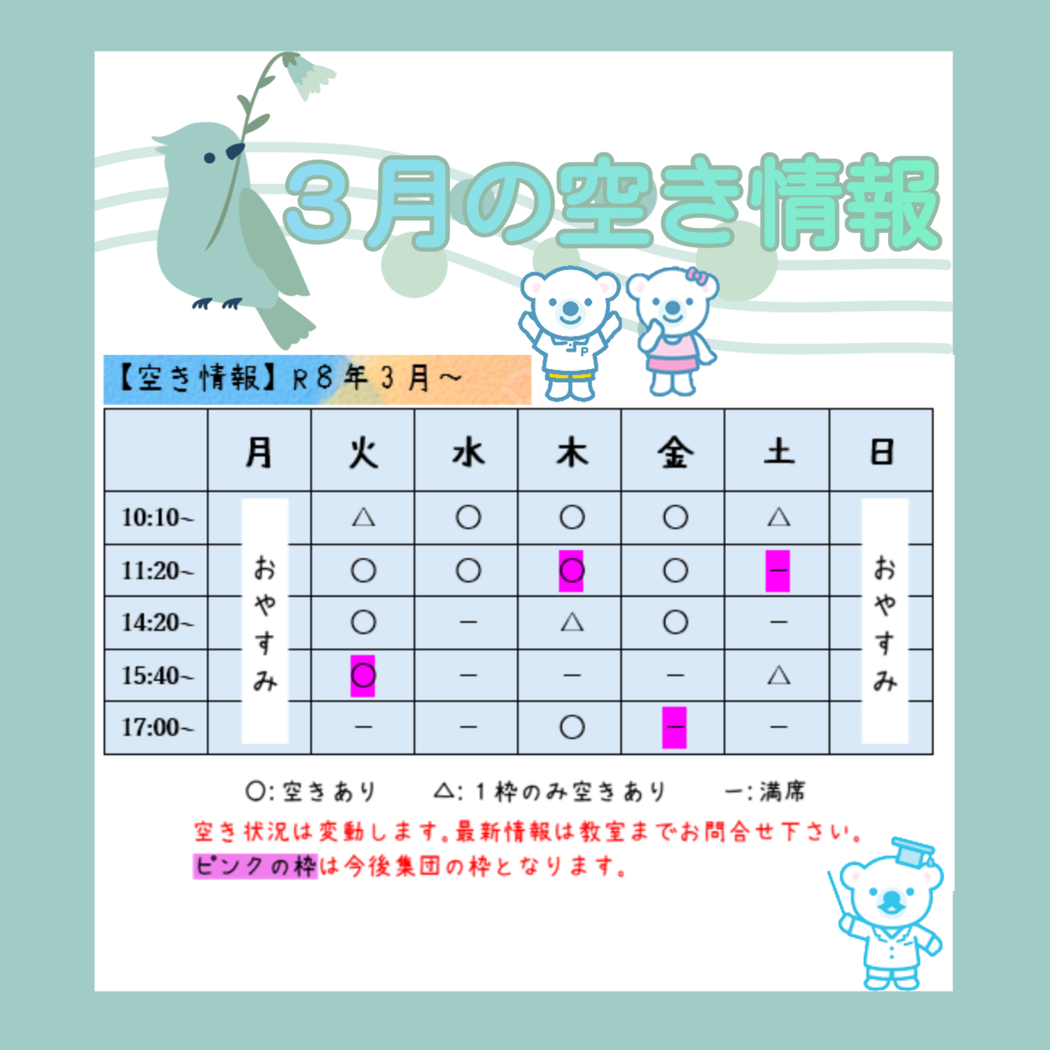 3月の空き情報をお知らせいたします☆